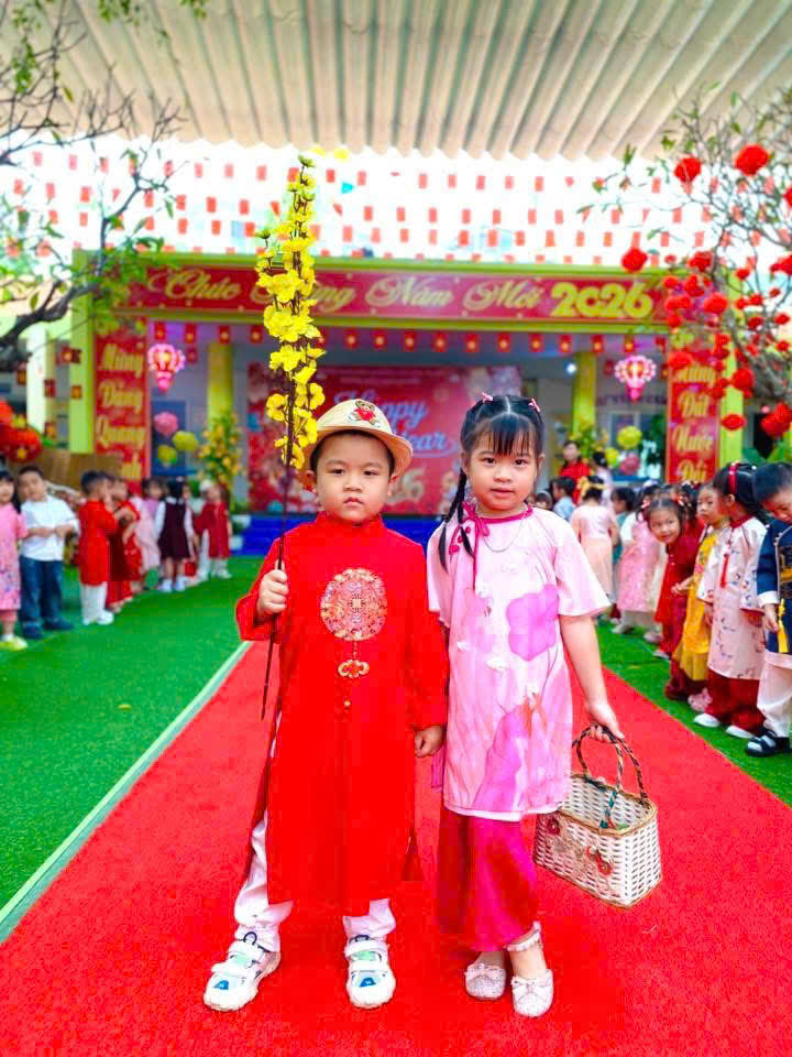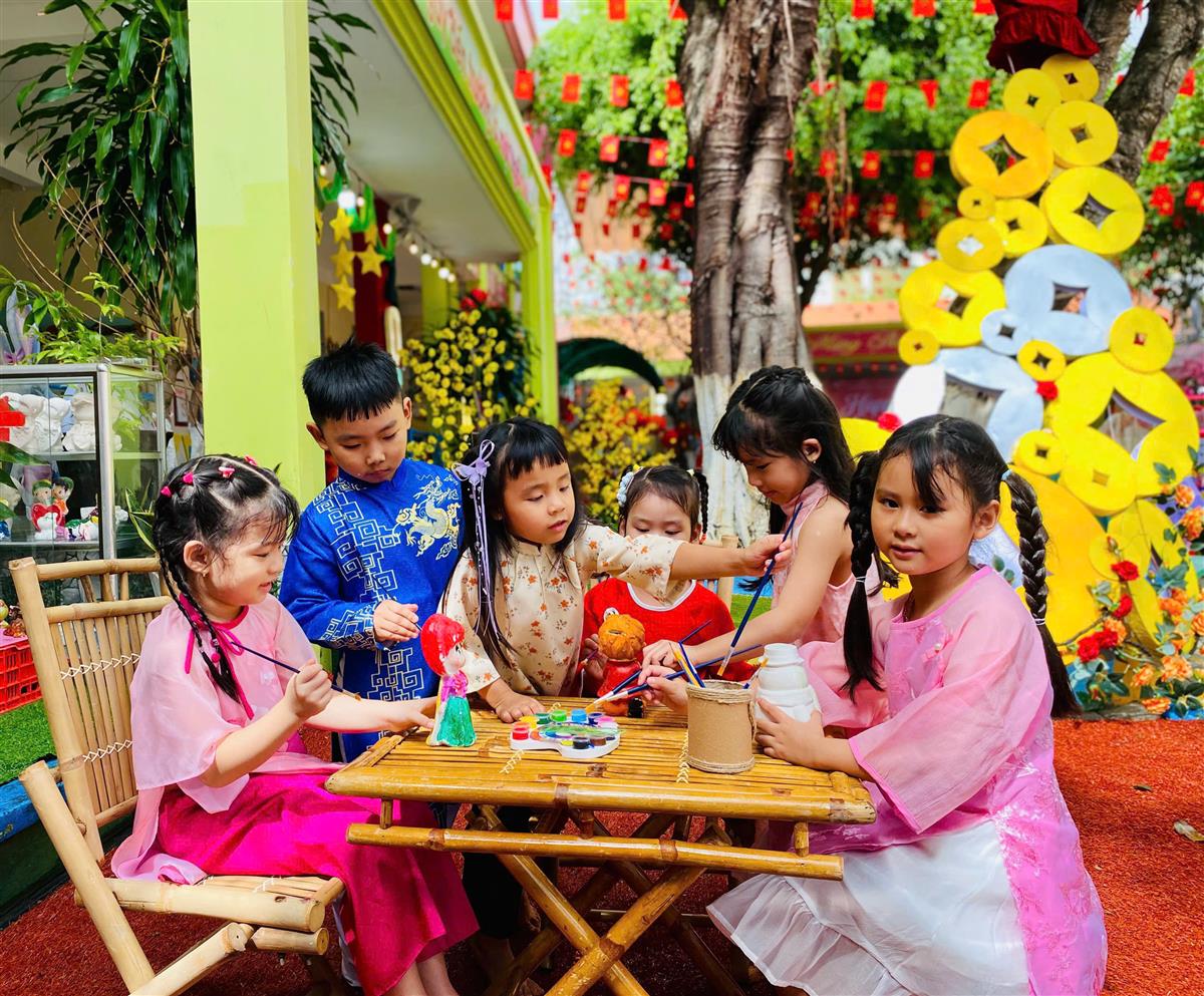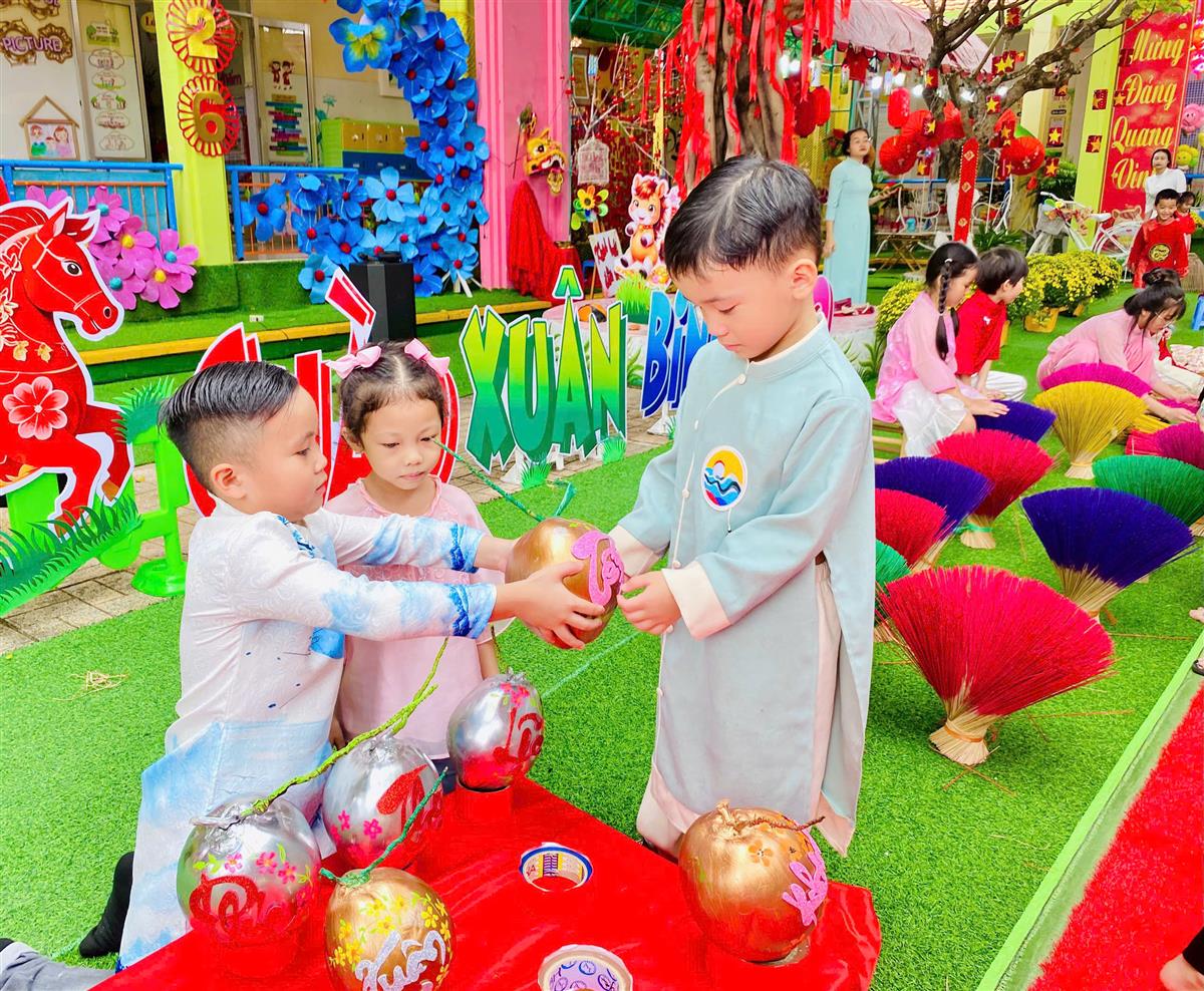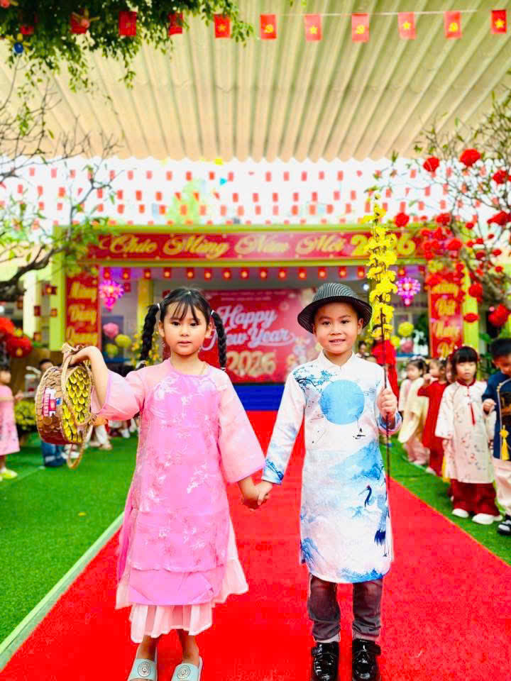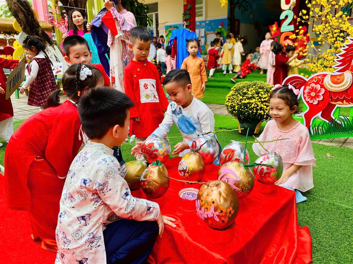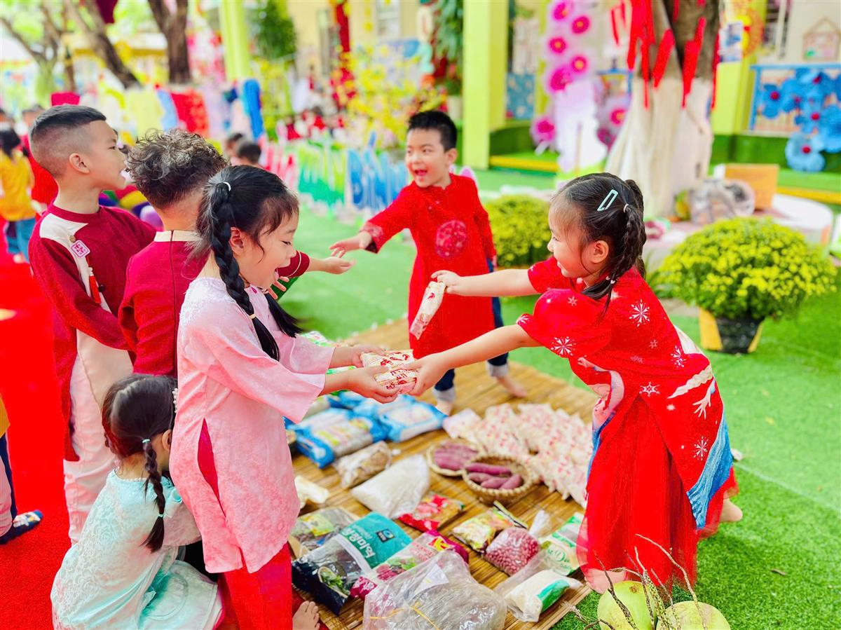 Tại phiên chợ Tết, các bé được hóa thân thành những “người bán – người mua” nhí, làm quen với các gian hàng Tết truyền thống, rèn kỹ năng giao tiếp và mạnh dạn, tự tin khi tham gia hoạt động tập thể. Bên cạnh đó, các trò chơi dân gian vui nhộn đã mang đến không khí sôi nổi, giúp trẻ thêm hào hứng, gắn kết bạn bè.
