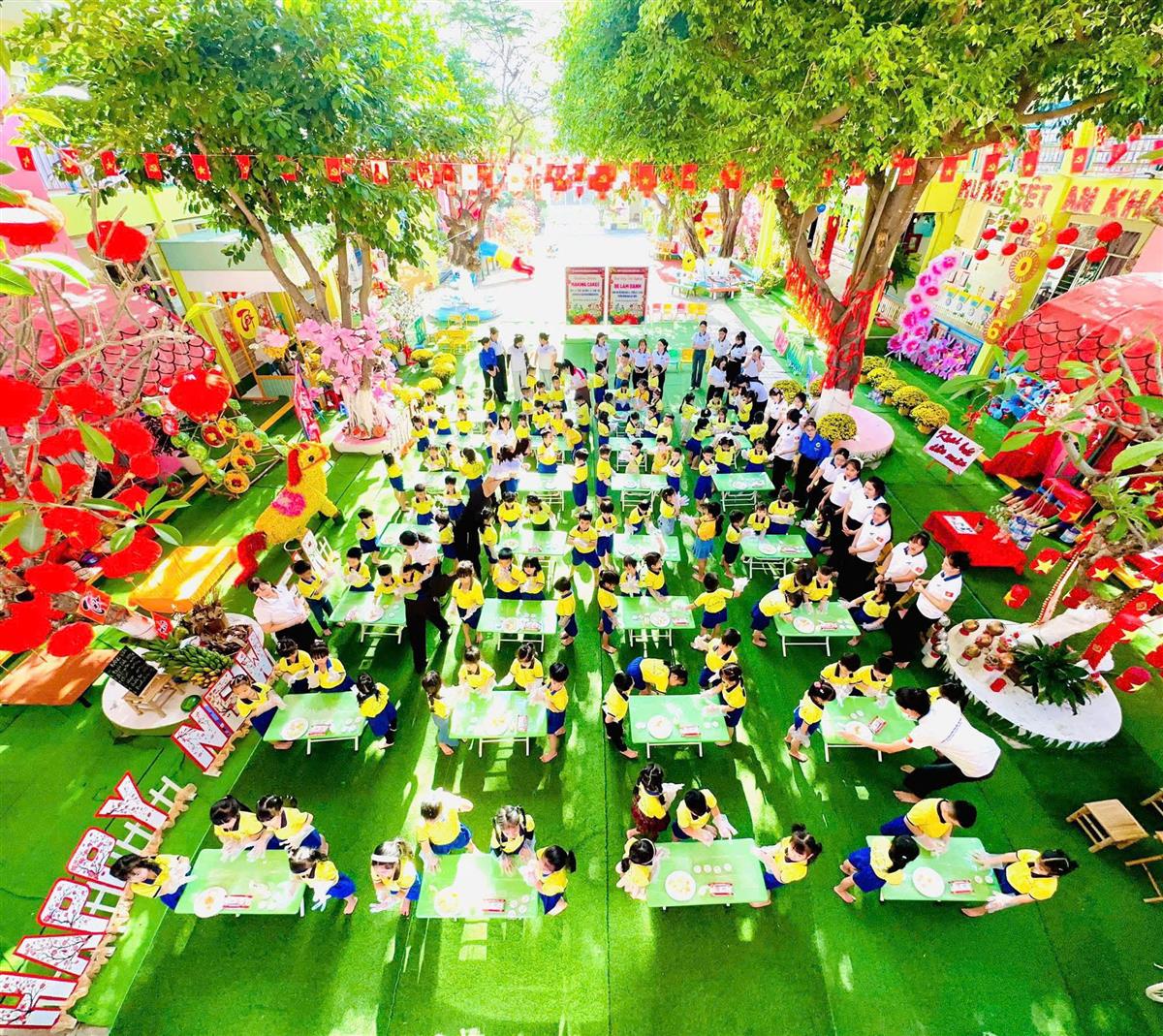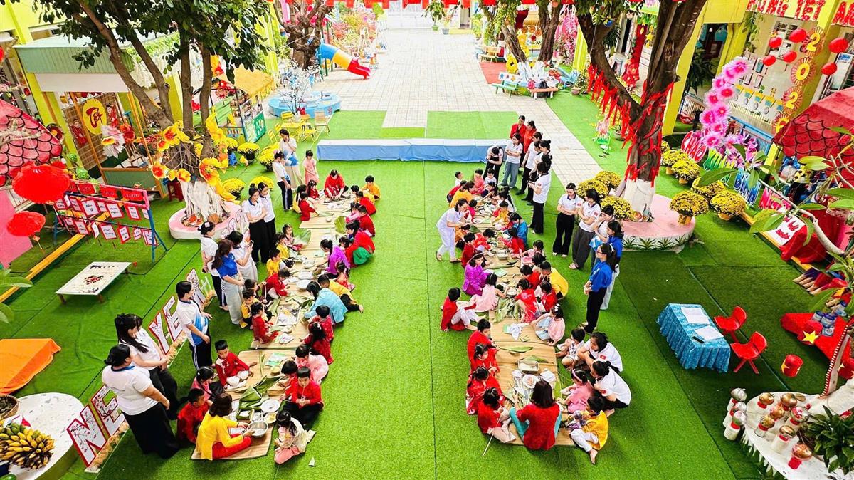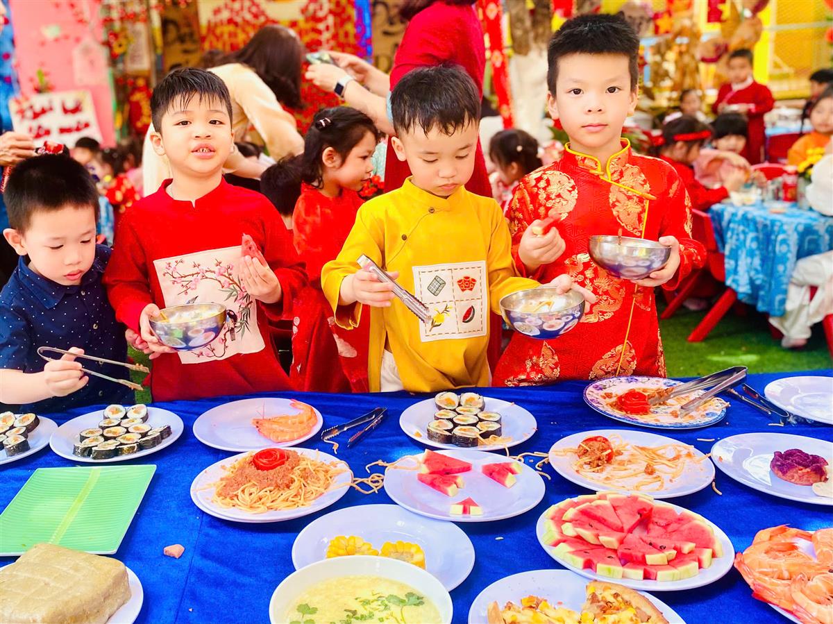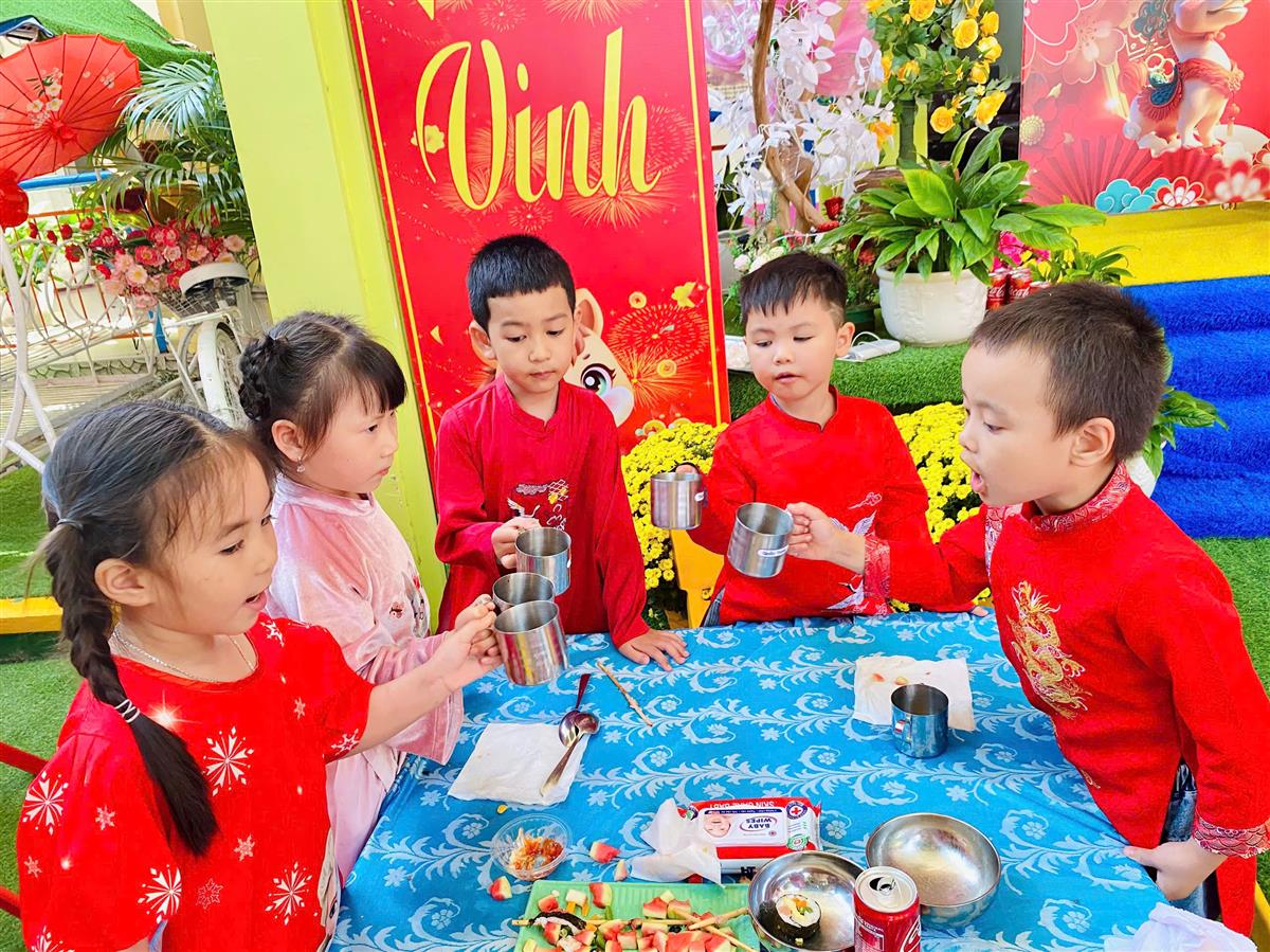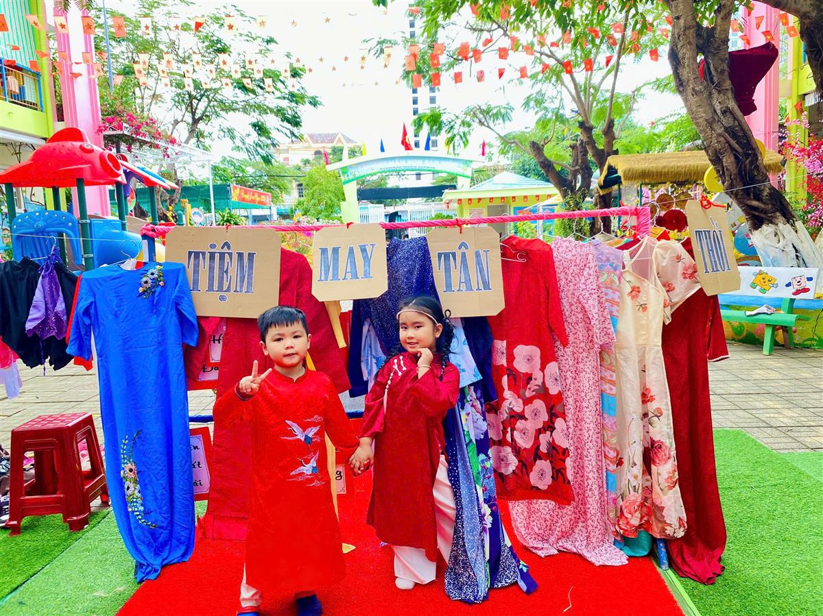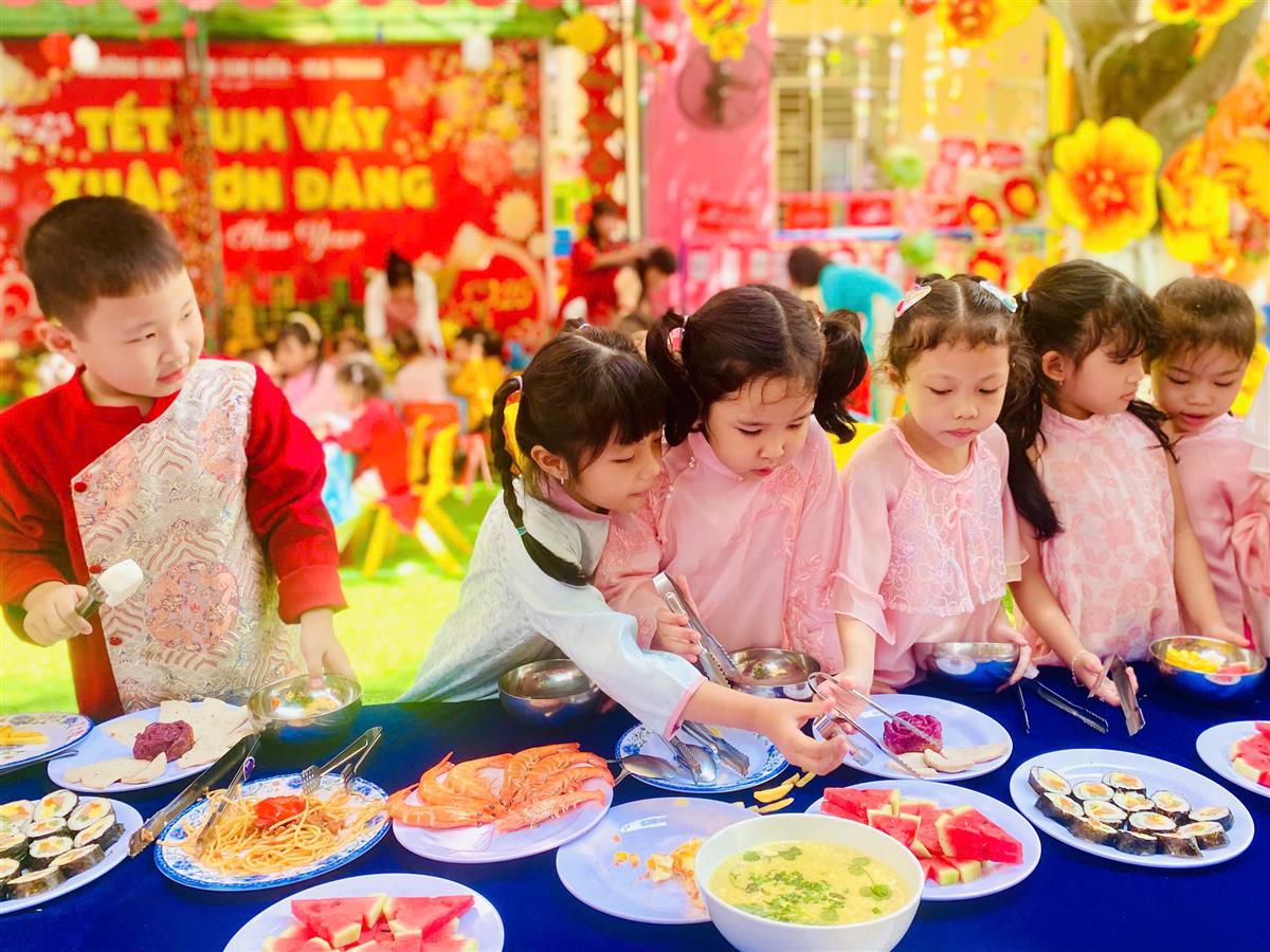 Tại phiên chợ Tết, các bé được hóa thân thành những “người bán – người mua” nhí, làm quen với các gian hàng Tết truyền thống, rèn kỹ năng giao tiếp và mạnh dạn, tự tin khi tham gia hoạt động tập thể. Bên cạnh đó, các trò chơi dân gian vui nhộn đã mang đến không khí sôi nổi, giúp trẻ thêm hào hứng, gắn kết bạn bè.